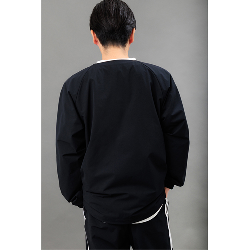 裾はアジャストゴム仕様でフィット感を調整でき、少し深めのクルーネックはネックウォーマーなどとのレイヤードにも相性抜群です。