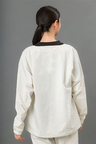 裾はアジャストゴム仕様でフィット感を調整でき、少し深めのクルーネックはネックウォーマーなどとのレイヤードにも相性抜群です。