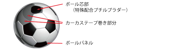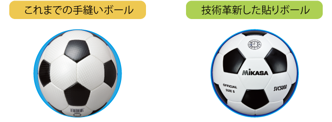 手縫いサッカーボールは球形にばらつきがあるが、技術革新した貼りボールはカーカスの段階で球形を成形するので、より真球度が高くなる。
