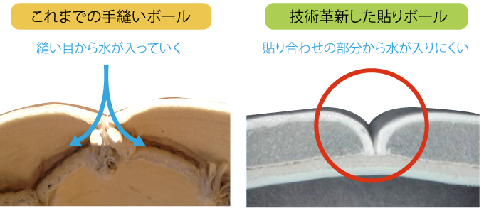 手縫いは、縫い目部分から水が浸入しボールが重くなるが、技術革新した貼りボールは貼り目部分から水が入りにくい。